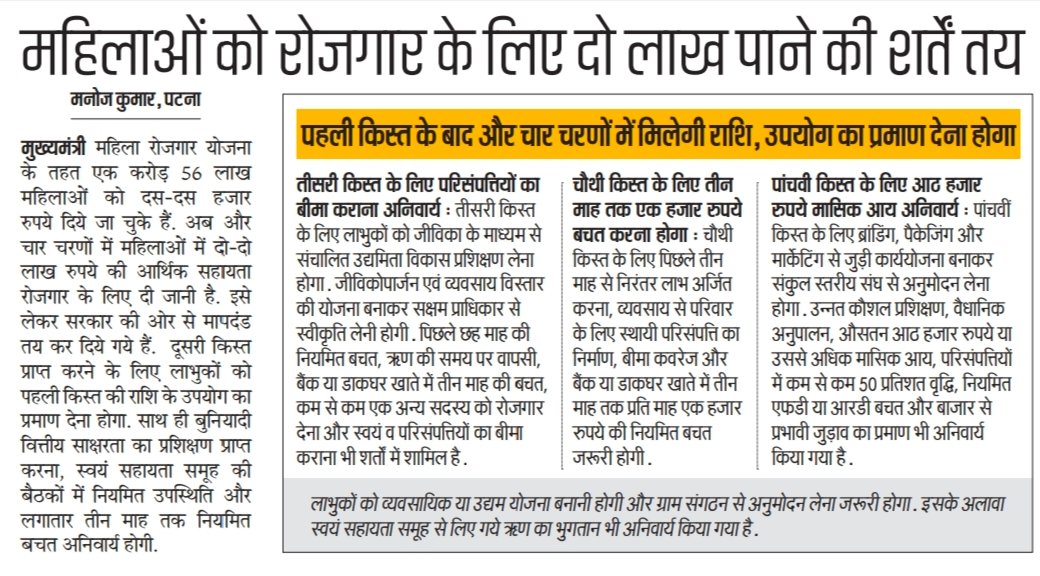 मुख्यमंत्री महिला रोजगार योजना के तहत एक करोड़ 56 लाख महिलाओं को दस-दस हजार रुपये दिये जा चुके हैं. अब और चार चरणों में महिलाओं में दो-दो लाख रुपये की आर्थिक सहायता रोजगार के लिए दी जानी है. इसे लेकर सरकार की ओर से मापदंड तय कर दिये गये हैं. दूसरी किस्त प्राप्त करने के लिए लाभुकों को पहली किस्त की राशि के उपयोग का प्रमाण देना होगा. साथ ही बुनियादी वित्तीय साक्षरता का प्रशिक्षण प्राप्त करना, स्वयं सहायता समूह की बैठकों में नियमित उपस्थिति और लगातार तीन माह तक नियमित बचत अनिवार्य होगी.